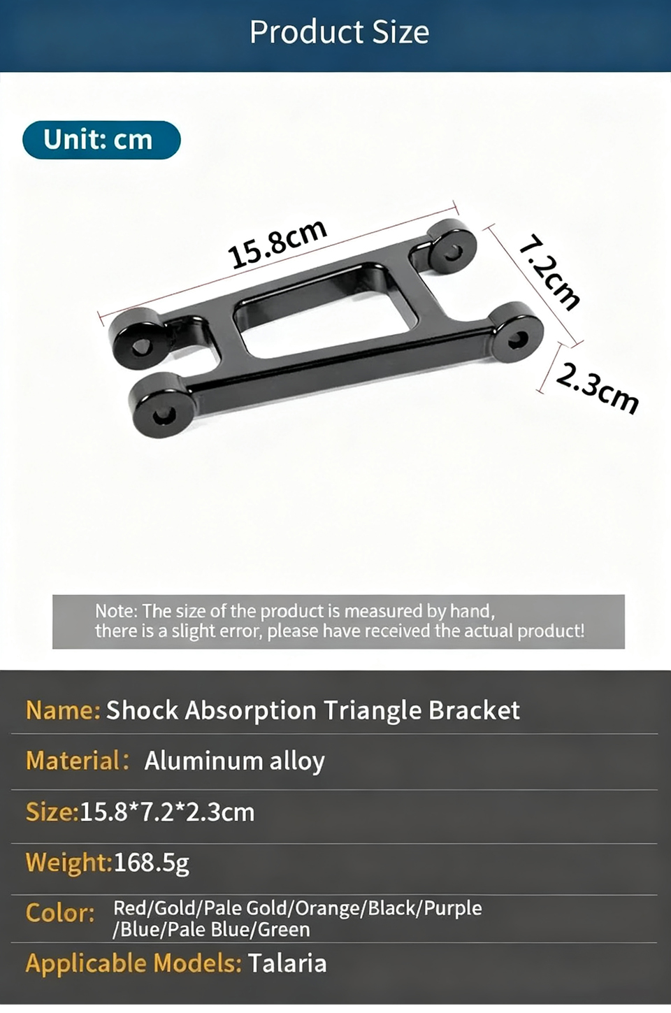 Name: Shock Absorption Triangle Bracket Material:Aluminum alloy Size:15.8*7.2*2.3cm Weight:168.5g Color:Red/Gold/Pale Gold/Orange/Black/Purple /Blue/Pale Blue/Green Applicable Models: Talaria...