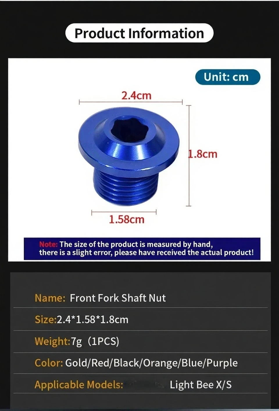 Name: Front Fork Shaft Nut Size:2.4*1.58*1.8cm Weight:7g(1PCS) Color: Gold/Red/Black/Orange/Blue/Purple Applicable Models:Light Bee X/S ...