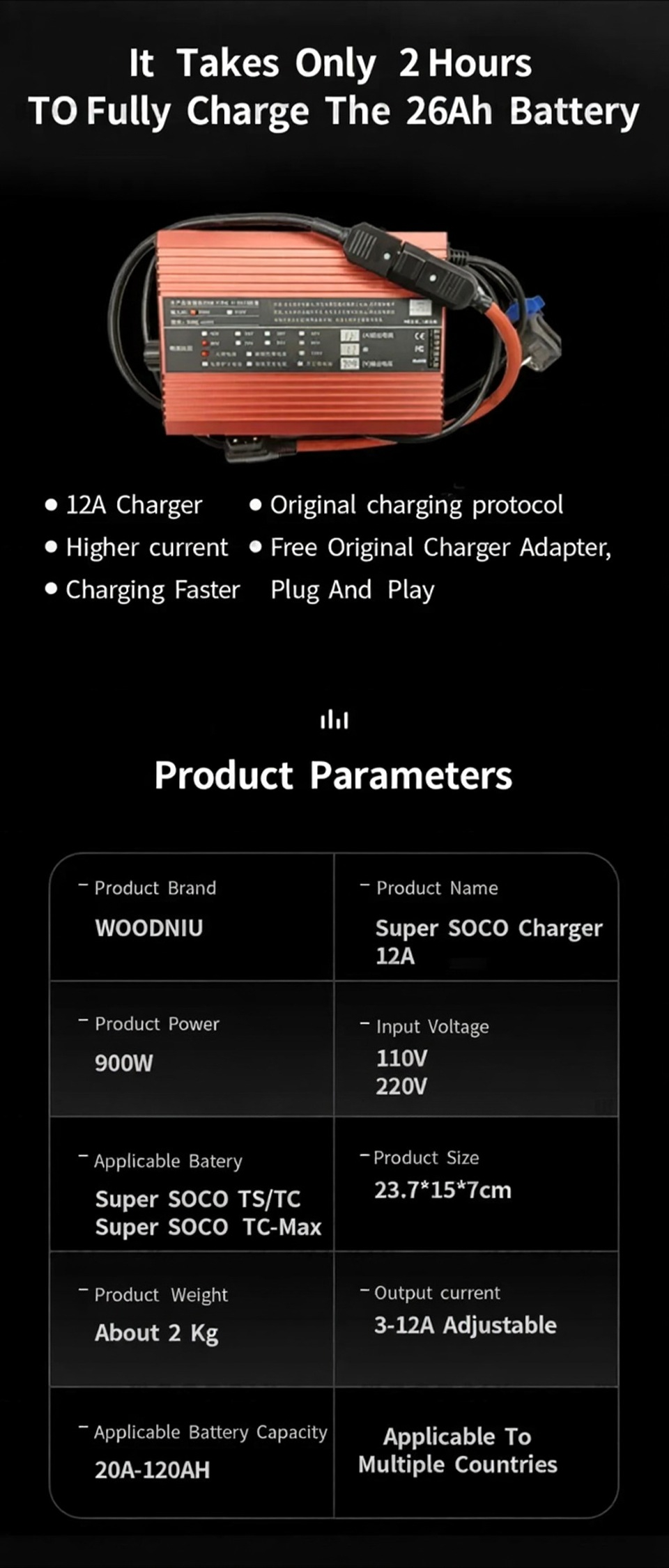 product brand: WOODNIU Product Name: Super SOCO Charger 12A
